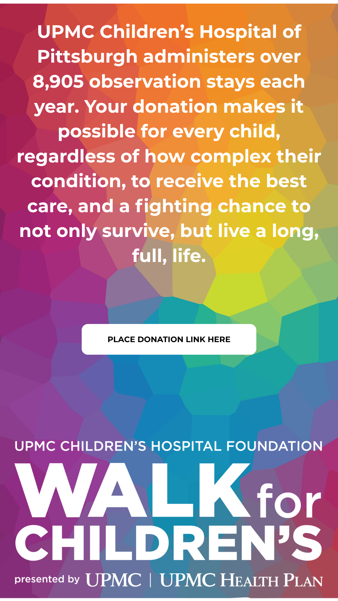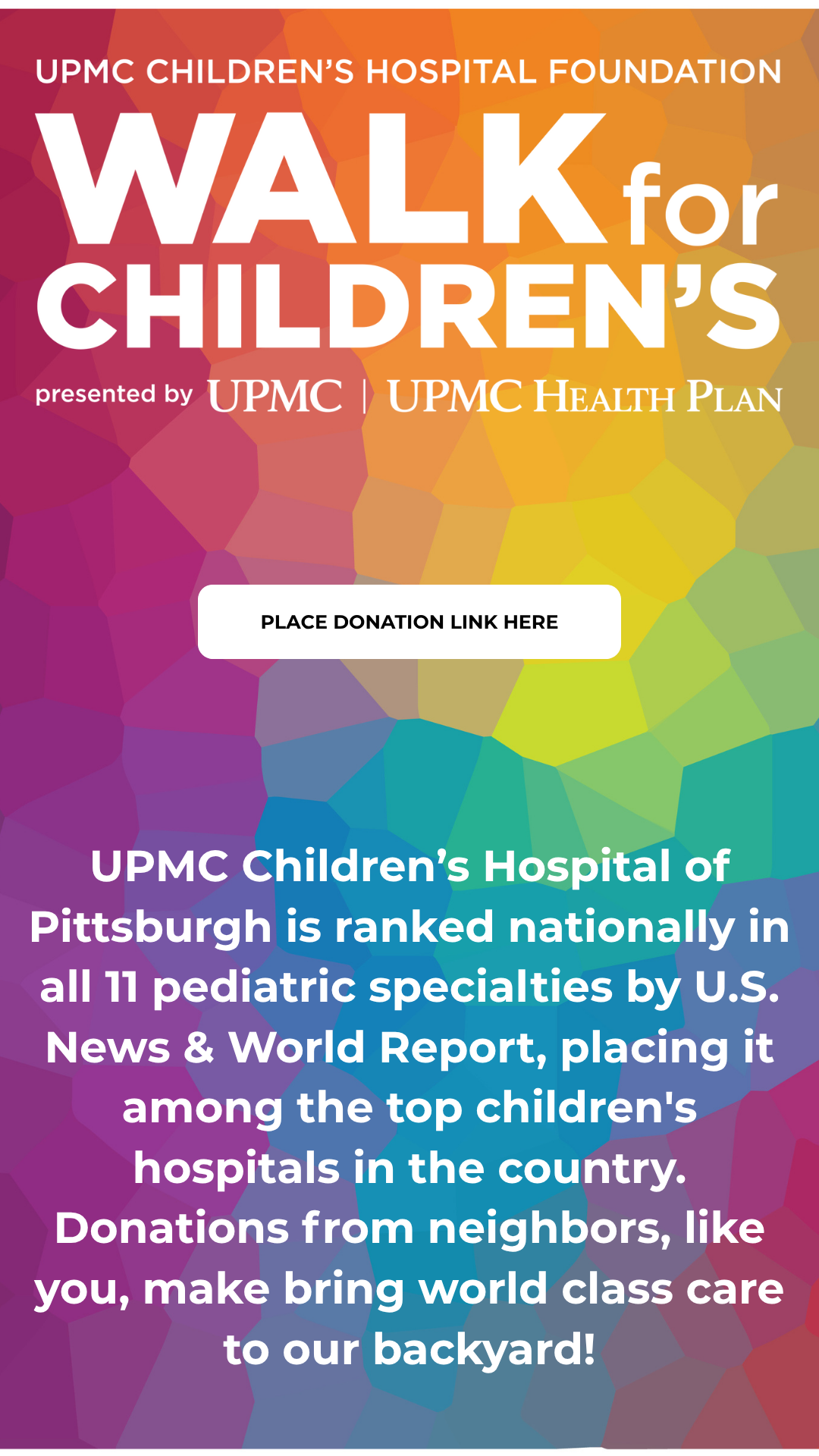 Then, create a post sharing your unique story. What makes you passionate about our mission? Tag us @ChildrensPgh and use the hashtag #WalkForChildrens. You’d be surprised who may donate to you just from seeing your post on social media.